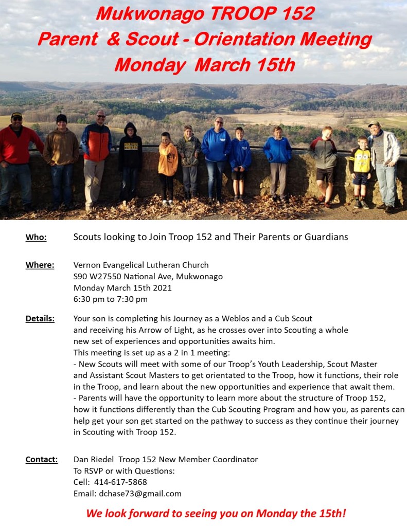Would your son like to become a Scout in Troop 152? Join us, at our Parent and New Scout Orientation meeting on March 15th.