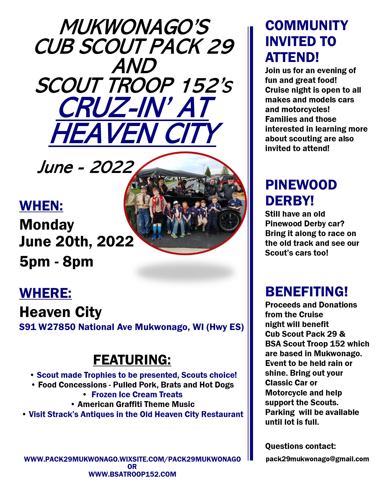 Why: Proceeds and Donations from the Cruise Night will benefit Cub Scouts Pack 29 and Troop 152 Mukwonago. Event will be held rain or shine.